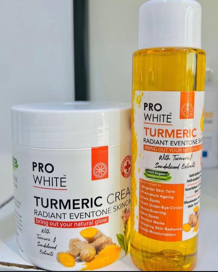 Pro White Turmeric Cream: Pro White Turmeric Cream is a no-greasy cream that offers relief from dryness leaving skin feeling soft and moisturized. More importantly it has Turmeric, Vitamin C, Vitamin E, and natural oils that are all immensely beneficial for skin health, radiance, tone and texture. Pro White Turmeric Oil: Pro White Turmeric Radiant Even Tone Skin Oil may brighten and improve skin within three weeks. These glowing benefits are likely the result of powerful antioxidants and anti-inflammatory compounds working together to heal and bring out natural health of skin.